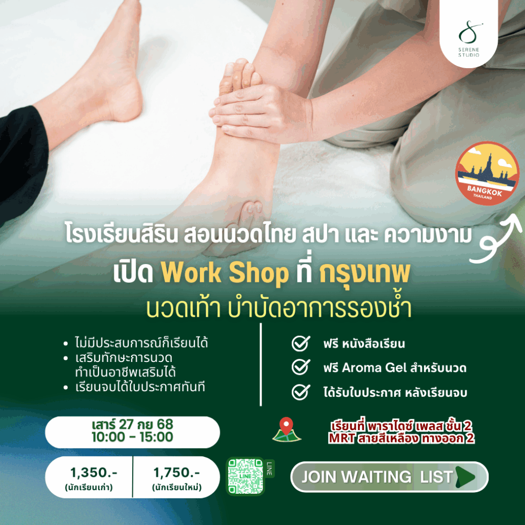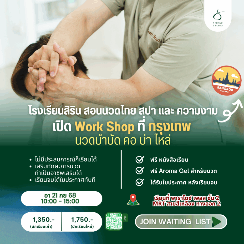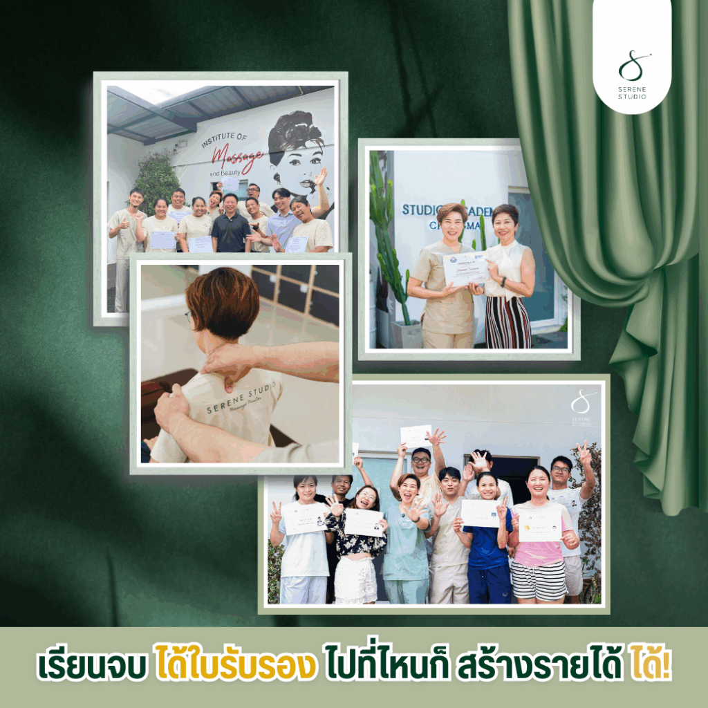 Home SERENE STUDIO CHIANGMAI โรงเรียน สิริน สอนนวดไทย สปา และ ความงาม สอนนวดแผนไทย สอนนวดสปาสร้างอาชีพ สอนนวดหน้าเพิ่มรายได้ สอนนวดแก้อาการ สอนนวดน้ำมัน เตรียมพร้อมทำงานต่างประเทศ การันตีขึ้นทะเบียนหมอนวดได้ 100% รับปรึกษาเปิดร้านนวด ทั้งในไทย และ ในต่างประเทศ เรียนนวดไทยที่ไหนดี? ถึงได้ใบประกอบที่สามารถขึ้นทะเบียนหมอนวดได้ อาชีพนวดเป็นอาชีพที่รายได้ดี ลงทุนน้อย คืนทุนเร็ว หลายคนจึงสนใจเรียนนวด เพื่อสร้างอาชีพใหม่ หรือ อาชีพเสริม เพื่อหารายได้เสริมเช่น เปิดร้านนวด, สมัครงานนวด หรือ รับนวดตามบ้าน หลักสูตร 150 ชั่วโมง เหมาะกับ คนที่มองหาหลักสูตรเรียนนวดเพื่อสร้างอาชีพ เป็นวิชาชีพติดตัว สำหรับหลายๆ คนที่อยากทำงานนวดทั้งในไทย และ ทำงานต่างประเทศ หลังเรียนจบได้ใบประกาศหลักสุตร 150 ชั่วโมง ทั้ง ภาษาไทย และ ภาษาอังกฤษ พร้อมบริการขึ้นทะเบียนหมอนวด ทำงานนวด หรือ เปิดร้านนวดถูกต้องตามกฎหมาย Free! หลักสูตร 150 ชั่วโมง การันตีด้วยหลักสูตร ที่ขึ้นทะเบียนกับ 3 กระทรวง • กระทรวงสาธารณสุข • กระทรวงศึกษาธิการ • กระทรวงต่างประเทศ เรียนนวด กับ Serene Thai Massage Spa and Beauty School โรงเรียนสอนนวดที่มีคุณภาพการสอนที่ดีที่สุดในเชียงใหม่ ด้วยหลักสูตรเปิดสอนนวดเยอะที่สุดในเชียงใหม่ Promotion นวดศีรษะบรรเทาอาการไมเกรน วันเสาร์ ที่20 กันยายน 2568 เวลา 10:00 – 15:00 น.เรียนที่ Paradise Place ชั้น 2| MRT สายสีเหลือง ทางออก 2 กรุงเทพ ฯ นวดบำบัดคอบ่าไหล่ วันอาทิตย์ที่ 21 กันยายน 2568 เวลา 10:00 – 15:00 น.เรียนที่ Paradise Place ชั้น 2| MRT สายสีเหลือง ทางออก 2 กรุงเทพ ฯ นวดเท้าบำบัดอาการรองช้ำ วันเสาร์ที่ 27 กันยายน 2568 เวลา 10:00 – 15:00 น.เรียนที่ Paradise Place ชั้น 2| MRT สายสีเหลือง ทางออก 2 กรุงเทพ ฯ นวดหน้าท้องดีท๊อกลำไส้ปรับสมดุลย์วันอาทิตย์ที่ 28 กันยายน 2568 เวลา 10:00 – 15:00 น.เรียนที่ Paradise Place ชั้น 2| MRT สายสีเหลือง ทางออก 2 กรุงเทพ ฯ การันตี จากนักเรียนกว่า 30,000 คน ทั่วไทยทั่วโลก ภาพบรรยากาศการเรียน ทดลองเรียนฟรี 3 วัน ไม่พอใจไม่ต้องจ่ายเงิน การันตี นักเรียนสามารถกลับมาทบทวนได้ฟรี ! หลักสูตรคุณภาพ มาตรฐานระดับโลก หลักสูตรของเรา ได้รับการรับรองมาตรฐาน การเรียนการสอน จากกระทรวงศึกษาธิการ กระทรวงสาธารณสุข กระทรวงแรงงาน และกระทรวงการต่างประเทศ ใบประกาศมีหน่วยงานของรัฐรองรับ เพื่อประโยชน์ในการทำงานทั้งในประเทศและต่างประเทศ โดยเรามุ่งเน้นการเรียนการสอนและเตรียมความพร้อมด้านธุรกิจนวดไทยและสปา ให้ก้าวสู่ประชาคมเศรษฐกิจอาเซียน (AEC) ได้อย่างมืออาชีพ เนื่องจาก AEC ถือเป็นโอกาสทองของธุรกิจนวดไทยและสปา ได้การรับรองจาก กระทรวง และ สมาคม ทั้งในระดับประเทศและระดับสากล รายละเ