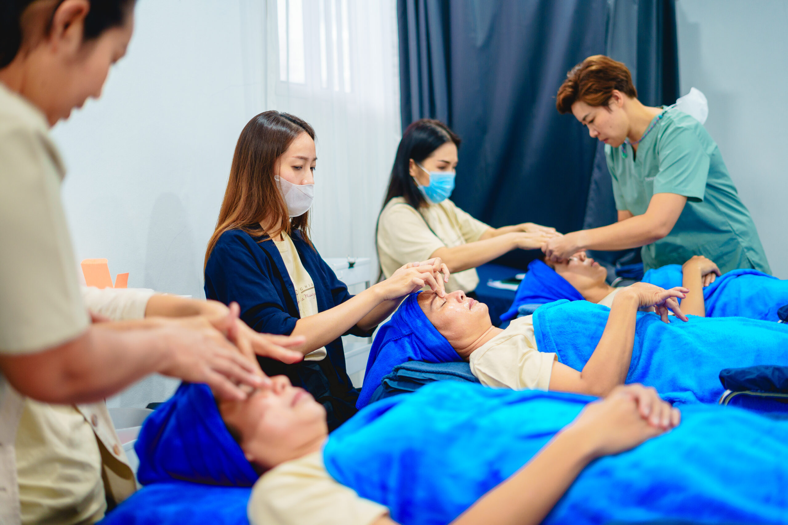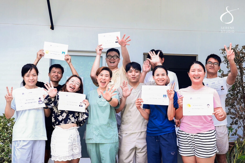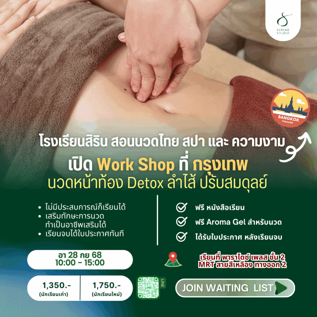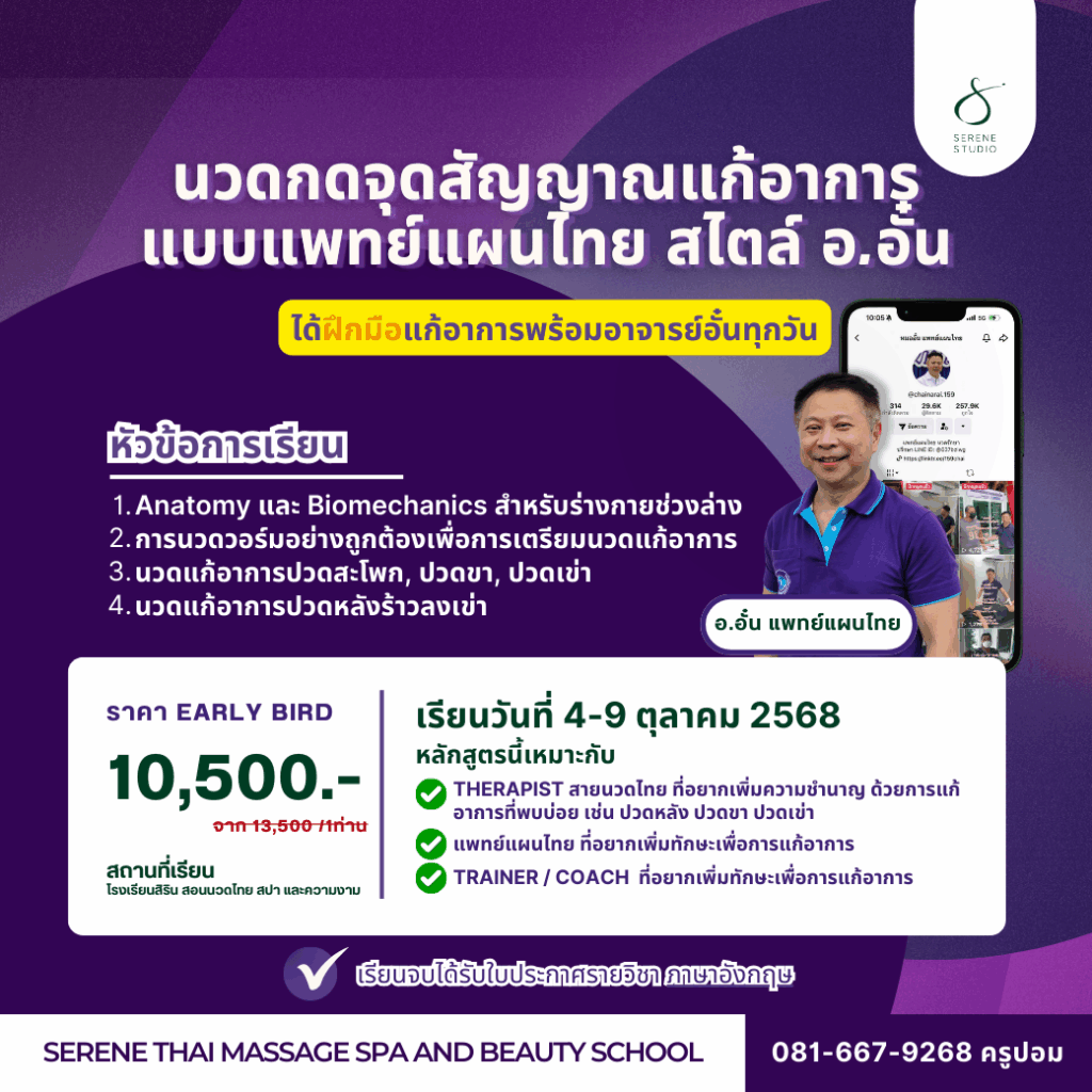 Home SERENE STUDIO CHIANGMAI โรงเรียน สิริน สอนนวดไทย สปา และ ความงาม สอนนวดแผนไทย สอนนวดสปาสร้างอาชีพ สอนนวดหน้าเพิ่มรายได้ สอนนวดแก้อาการ สอนนวดน้ำมัน เตรียมพร้อมทำงานต่างประเทศ การันตีขึ้นทะเบียนหมอนวดได้ 100% รับปรึกษาเปิดร้านนวด ทั้งในไทย และ ในต่างประเทศ เรียนนวดไทยที่ไหนดี? ถึงได้ใบประกอบที่สามารถขึ้นทะเบียนหมอนวดได้ อาชีพนวดเป็นอาชีพที่รายได้ดี ลงทุนน้อย คืนทุนเร็ว หลายคนจึงสนใจเรียนนวด เพื่อสร้างอาชีพใหม่ หรือ อาชีพเสริม เพื่อหารายได้เสริมเช่น เปิดร้านนวด, สมัครงานนวด หรือ รับนวดตามบ้าน หลักสูตร 150 ชั่วโมง เหมาะกับ คนที่มองหาหลักสูตรเรียนนวดเพื่อสร้างอาชีพ เป็นวิชาชีพติดตัว สำหรับหลายๆ คนที่อยากทำงานนวดทั้งในไทย และ ทำงานต่างประเทศ หลังเรียนจบได้ใบประกาศหลักสุตร 150 ชั่วโมง ทั้ง ภาษาไทย และ ภาษาอังกฤษ พร้อมบริการขึ้นทะเบียนหมอนวด ทำงานนวด หรือ เปิดร้านนวดถูกต้องตามกฎหมาย Free! หลักสูตร 150 ชั่วโมง การันตีด้วยหลักสูตร ที่ขึ้นทะเบียนกับ 3 กระทรวง • กระทรวงสาธารณสุข • กระทรวงศึกษาธิการ • กระทรวงต่างประเทศ เรียนนวด กับ Serene Thai Massage Spa and Beauty School โรงเรียนสอนนวดที่มีคุณภาพการสอนที่ดีที่สุดในเชียงใหม่ ด้วยหลักสูตรเปิดสอนนวดเยอะที่สุดในเชียงใหม่ Promotion นวดศีรษะบรรเทาอาการไมเกรน วันเสาร์ ที่20 กันยายน 2568 เวลา 10:00 – 15:00 น.เรียนที่ Paradise Place ชั้น 2| MRT สายสีเหลือง ทางออก 2 กรุงเทพ ฯ นวดบำบัดคอบ่าไหล่ วันอาทิตย์ที่ 21 กันยายน 2568 เวลา 10:00 – 15:00 น.เรียนที่ Paradise Place ชั้น 2| MRT สายสีเหลือง ทางออก 2 กรุงเทพ ฯ นวดเท้าบำบัดอาการรองช้ำ วันเสาร์ที่ 27 กันยายน 2568 เวลา 10:00 – 15:00 น.เรียนที่ Paradise Place ชั้น 2| MRT สายสีเหลือง ทางออก 2 กรุงเทพ ฯ นวดหน้าท้องดีท๊อกลำไส้ปรับสมดุลย์วันอาทิตย์ที่ 28 กันยายน 2568 เวลา 10:00 – 15:00 น.เรียนที่ Paradise Place ชั้น 2| MRT สายสีเหลือง ทางออก 2 กรุงเทพ ฯ การันตี จากนักเรียนกว่า 30,000 คน ทั่วไทยทั่วโลก ภาพบรรยากาศการเรียน ทดลองเรียนฟรี 3 วัน ไม่พอใจไม่ต้องจ่ายเงิน การันตี นักเรียนสามารถกลับมาทบทวนได้ฟรี ! หลักสูตรคุณภาพ มาตรฐานระดับโลก หลักสูตรของเรา ได้รับการรับรองมาตรฐาน การเรียนการสอน จากกระทรวงศึกษาธิการ กระทรวงสาธารณสุข กระทรวงแรงงาน และกระทรวงการต่างประเทศ ใบประกาศมีหน่วยงานของรัฐรองรับ เพื่อประโยชน์ในการทำงานทั้งในประเทศและต่างประเทศ โดยเรามุ่งเน้นการเรียนการสอนและเตรียมความพร้อมด้านธุรกิจนวดไทยและสปา ให้ก้าวสู่ประชาคมเศรษฐกิจอาเซียน (AEC) ได้อย่างมืออาชีพ เนื่องจาก AEC ถือเป็นโอกาสทองของธุรกิจนวดไทยและสปา ได้การรับรองจาก กระทรวง และ สมาคม ทั้งในระดับประเทศและระดับสากล รายละเ